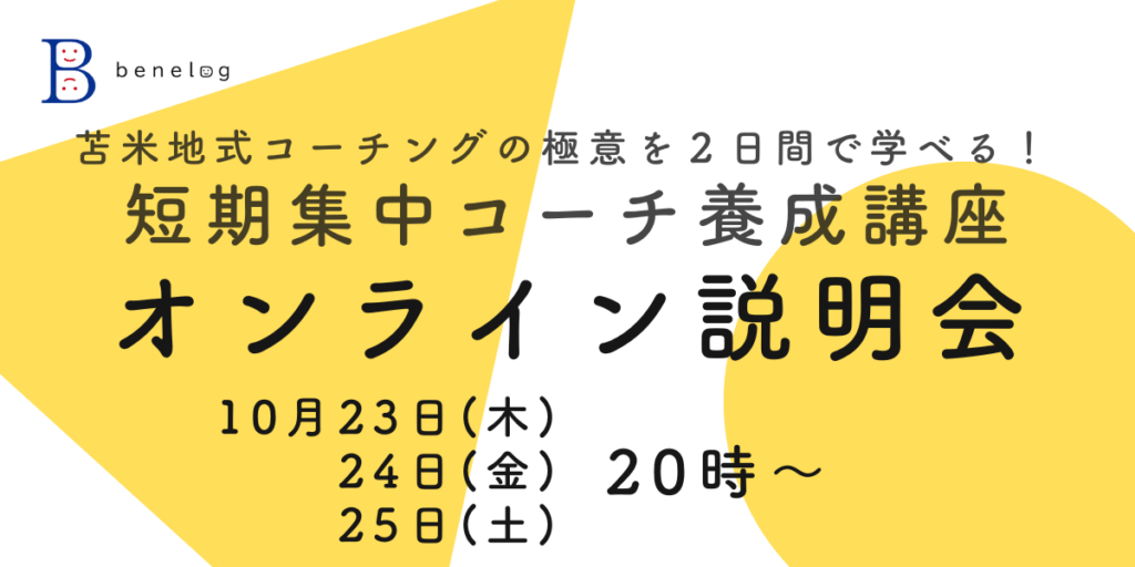 10月23日(木)、24日(金)、25日(土)の20時から1時間弱で「短期集中コーチ養成講座」のオンライン説明会(無料)を開催します。